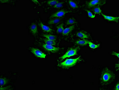 Immunofluorescent analysis of Hela cells using CSB-PA021539LA01HU at dilution of 1:100 and Alexa Fluor 488-congugated AffiniPure Goat Anti-Rabbit IgG(H+L)