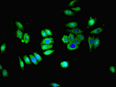 Immunofluorescent analysis of HepG2 cells using CSB-PA021539LA01HU at dilution of 1:100 and Alexa Fluor 488-congugated AffiniPure Goat Anti-Rabbit IgG(H+L)