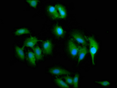 Immunofluorescence staining of Hela cells with CSB-PA021558LA01HU at 1:200, counter-stained with DAPI. The cells were fixed in 4% formaldehyde, permeabilized using 0.2% Triton X-100 and blocked in 10% normal Goat Serum. The cells were then incubated with the antibody overnight at 4°C. The secondary antibody was Alexa Fluor 488-congugated AffiniPure Goat Anti-Rabbit IgG(H+L).