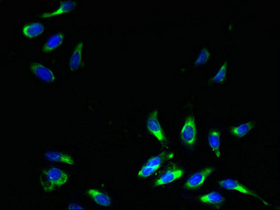 Immunofluorescent analysis of Hela cells using CSB-PA021577LA01HU at dilution of 1:100 and Alexa Fluor 488-congugated AffiniPure Goat Anti-Rabbit IgG(H+L)