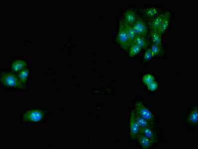 Immunofluorescent analysis of HepG2 cells using CSB-PA863984LA01HU at dilution of 1:100 and Alexa Fluor 488-congugated AffiniPure Goat Anti-Rabbit IgG(H+L)