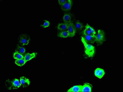 Immunofluorescent analysis of A431 cells using CSB-PA672077LA01HU at dilution of 1:100 and Alexa Fluor 488-congugated AffiniPure Goat Anti-Rabbit IgG(H+L)
