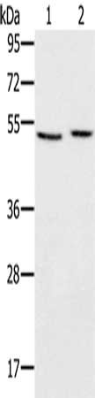 Gel: 8%SDS-PAGE, Lysate: 40 μg, Lane 1-2: Huvec cells, 293T cells, Primary antibody: CSB-PA940611(SLC39A7 Antibody) at dilution 1/200, Secondary antibody: Goat anti rabbit IgG at 1/8000 dilution, Exposure time: 20 seconds