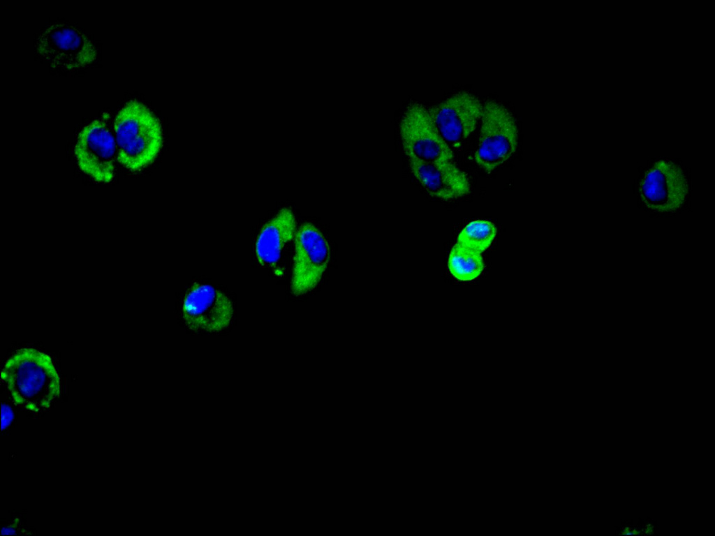 Immunofluorescence staining of Hela cell with CSB-PA849761LA01HU at 1:90, counter-stained with DAPI. The cells were fixed in 4% formaldehyde and blocked in 10% normal Goat Serum. The cells were then incubated with the antibody overnight at 4C. The secondary antibody was Alexa Fluor 488-congugated AffiniPure Goat Anti-Rabbit IgG(H+L).