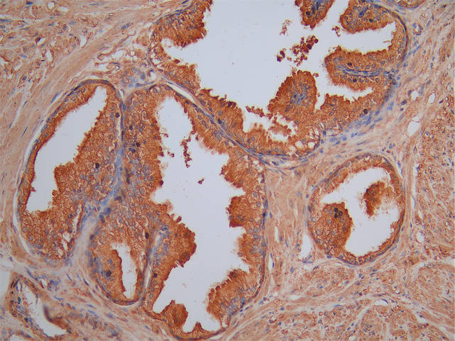 IHC image of CSB-PA849761LA01HU diluted at 1:100 and staining in paraffin-embedded human prostate cancer performed on a Leica BondTM system. After dewaxing and hydration, antigen retrieval was mediated by high pressure in a citrate buffer (pH 6.0). Section was blocked with 10% normal goat serum 30min at RT. Then primary antibody (1% BSA) was incubated at 4°C overnight. The primary is detected by a Goat anti-rabbit polymer IgG labeled by HRP and visualized using 0.05% DAB.