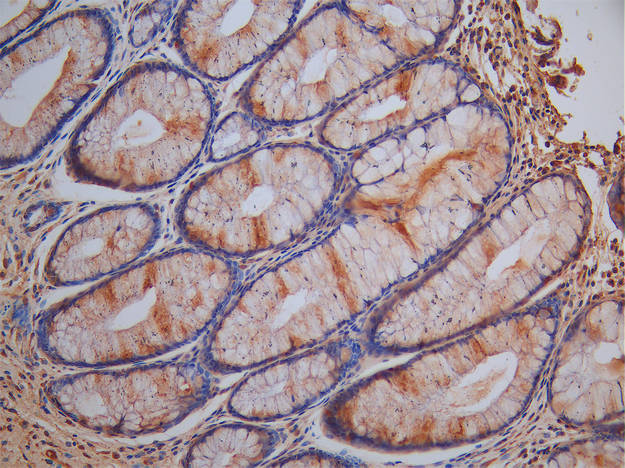 IHC image of CSB-PA849761LA01HU diluted at 1:100 and staining in paraffin-embedded human colorectal cancer performed on a Leica BondTM system. After dewaxing and hydration, antigen retrieval was mediated by high pressure in a citrate buffer (pH 6.0). Section was blocked with 10% normal goat serum 30min at RT. Then primary antibody (1% BSA) was incubated at 4°C overnight. The primary is detected by a Goat anti-rabbit polymer IgG labeled by HRP and visualized using 0.05% DAB.