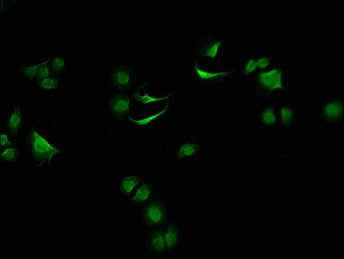 Immunofluorescence staining of A549 cells with CSB-PA851527LA11HU at 1:100, counter-stained with DAPI. The cells were fixed in 4% formaldehyde and blocked in 10% normal Goat Serum. The cells were then incubated with the antibody overnight at 4°C. The secondary antibody was Alexa Fluor 488-congugated AffiniPure Goat Anti-Rabbit IgG(H+L).