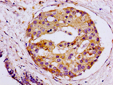 IHC image of CSB-PA021871LA01HU diluted at 1:100 and staining in paraffin-embedded human breast cancer performed on a Leica BondTM system. After dewaxing and hydration, antigen retrieval was mediated by high pressure in a citrate buffer (pH 6.0). Section was blocked with 10% normal goat serum 30min at RT. Then primary antibody (1% BSA) was incubated at 4°C overnight. The primary is detected by a biotinylated secondary antibody and visualized using an HRP conjugated ABC system.