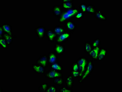 Immunofluorescence staining of Hela cells with CSB-PA021871LA01HU at 1:66, counter-stained with DAPI. The cells were fixed in 4% formaldehyde, permeabilized using 0.2% Triton X-100 and blocked in 10% normal Goat Serum. The cells were then incubated with the antibody overnight at 4°C. The secondary antibody was Alexa Fluor 488-congugated AffiniPure Goat Anti-Rabbit IgG(H+L).