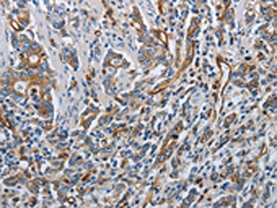 The image on the left is immunohistochemistry of paraffin-embedded Human gastric cancer tissue using CSB-PA634030(SOCS1 Antibody) at dilution 1/70, on the right is treated with synthetic peptide. (Original magnification: ×200)