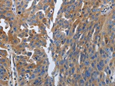 The image on the left is immunohistochemistry of paraffin-embedded Human ovarian cancer tissue using CSB-PA634030(SOCS1 Antibody) at dilution 1/70, on the right is treated with synthetic peptide. (Original magnification: ×200)