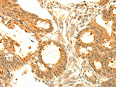 The image on the left is immunohistochemistry of paraffin-embedded Human colon cancer tissue using CSB-PA048810(SOCS6 Antibody) at dilution 1/50, on the right is treated with fusion protein. (Original magnification: ×200)