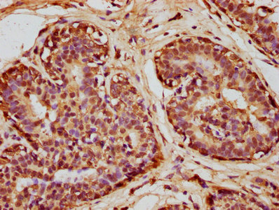 IHC image of CSB-PA02864A0Rb diluted at 1:100 and staining in paraffin-embedded human breast cancer performed on a Leica BondTM system. After dewaxing and hydration, antigen retrieval was mediated by high pressure in a citrate buffer (pH 6.0). Section was blocked with 10% normal goat serum 30min at RT. Then primary antibody (1% BSA) was incubated at 4°C overnight. The primary is detected by a biotinylated secondary antibody and visualized using an HRP conjugated SP system.