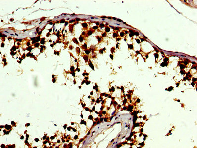 IHC image of CSB-PA022399LA01HU diluted at 1:500 and staining in paraffin-embedded human testis tissue performed on a Leica BondTM system. After dewaxing and hydration, antigen retrieval was mediated by high pressure in a citrate buffer (pH 6.0). Section was blocked with 10% normal goat serum 30min at RT. Then primary antibody (1% BSA) was incubated at 4°C overnight. The primary is detected by a biotinylated secondary antibody and visualized using an HRP conjugated SP system.