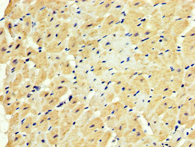 IHC image of CSB-PA022399LA01HU diluted at 1:500 and staining in paraffin-embedded human heart tissue performed on a Leica BondTM system. After dewaxing and hydration, antigen retrieval was mediated by high pressure in a citrate buffer (pH 6.0). Section was blocked with 10% normal goat serum 30min at RT. Then primary antibody (1% BSA) was incubated at 4°C overnight. The primary is detected by a biotinylated secondary antibody and visualized using an HRP conjugated SP system.