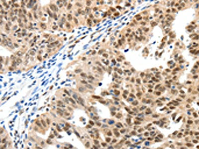 The image on the left is immunohistochemistry of paraffin-embedded Human colon cancer tissue using CSB-PA671453(SP1 Antibody) at dilution 1/40, on the right is treated with synthetic peptide. (Original magnification: ×200)