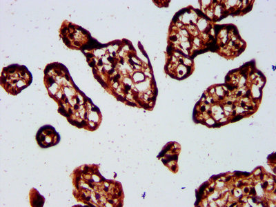 IHC image of CSB-PA22589A0Rb diluted at 1:500 and staining in paraffin-embedded human placenta tissue performed on a Leica BondTM system. After dewaxing and hydration, antigen retrieval was mediated by high pressure in a citrate buffer (pH 6.0). Section was blocked with 10% normal goat serum 30min at RT. Then primary antibody (1% BSA) was incubated at 4°C overnight. The primary is detected by a biotinylated secondary antibody and visualized using an HRP conjugated SP system.