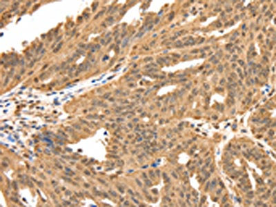 The image on the left is immunohistochemistry of paraffin-embedded Human ovarian cancer tissue using CSB-PA951144(SPATA20 Antibody) at dilution 1/70, on the right is treated with synthetic peptide. (Original magnification: ×200)