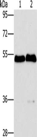 Gel: 8%SDS-PAGE, Lysate: 40 μg, Lane 1-2: Mouse brain tissue, Mouse liver tissue, Primary antibody: CSB-PA548094(SPHK2 Antibody) at dilution 1/200, Secondary antibody: Goat anti rabbit IgG at 1/8000 dilution, Exposure time: 5 minutes