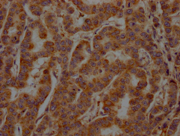 IHC image of CSB-PA022650LA11HU diluted at 1:200 and staining in paraffin-embedded human breast cancer performed on a Leica BondTM system. After dewaxing and hydration, antigen retrieval was mediated by high pressure in a citrate buffer (pH 6.0). Section was blocked with 10% normal goat serum 30min at RT. Then primary antibody (1% BSA) was incubated at 4°C overnight. The primary is detected by a Goat anti-rabbit polymer IgG labeled by HRP and visualized using 0.05% DAB.