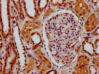 IHC image of CSB-PA880121LA01HU diluted at 1:600 and staining in paraffin-embedded human kidney tissue performed on a Leica BondTM system. After dewaxing and hydration, antigen retrieval was mediated by high pressure in a citrate buffer (pH 6.0). Section was blocked with 10% normal goat serum 30min at RT. Then primary antibody (1% BSA) was incubated at 4°C overnight. The primary is detected by a biotinylated secondary antibody and visualized using an HRP conjugated SP system.