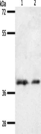 Gel: 10%SDS-PAGE, Lysate: 60 μg, Lane 1-2: 293T cells, hela cells, Primary antibody: CSB-PA075436(SSTR1 Antibody) at dilution 1/500, Secondary antibody: Goat anti rabbit IgG at 1/8000 dilution, Exposure time: 30 seconds