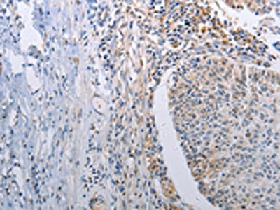 The image on the left is immunohistochemistry of paraffin-embedded Human lung cancer tissue using CSB-PA563679(STAT1 Antibody) at dilution 1/30, on the right is treated with fusion protein. (Original magnification: ×200)