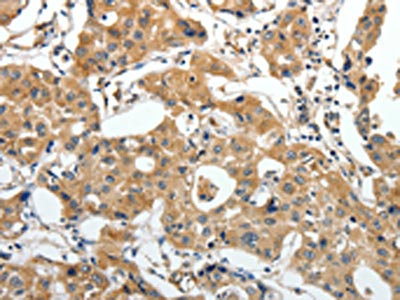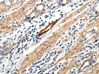 The image on the left is immunohistochemistry of paraffin-embedded Human gastric cancer tissue using CSB-PA590264(STEAP4 Antibody) at dilution 1/25, on the right is treated with synthetic peptide. (Original magnification: ×200)