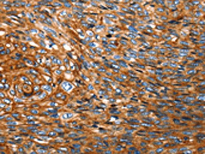 The image on the left is immunohistochemistry of paraffin-embedded Human esophagus cancer tissue using CSB-PA291750(STK33 Antibody) at dilution 1/30, on the right is treated with fusion protein. (Original magnification: ×200)