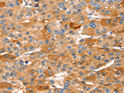 The image on the left is immunohistochemistry of paraffin-embedded Human liver cancer tissue using CSB-PA291750(STK33 Antibody) at dilution 1/30, on the right is treated with fusion protein. (Original magnification: ×200)