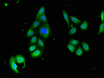 Immunofluorescent analysis of HepG2 cells using CSB-PA851552LA01HU at dilution of 1:100 and Alexa Fluor 488-congugated AffiniPure Goat Anti-Rabbit IgG(H+L)