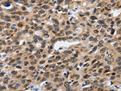 The image on the left is immunohistochemistry of paraffin-embedded Human ovarian cancer tissue using CSB-PA314476(SUMO1 Antibody) at dilution 1/20, on the right is treated with synthetic peptide. (Original magnification: ×200)