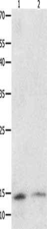 Gel: 10+12+15%SDS-PAGE, Lysate: 40 μg, Lane 1-2: Jukart cells, A549 cells, Primary antibody: CSB-PA314476(SUMO1 Antibody) at dilution 1/350, Secondary antibody: Goat anti rabbit IgG at 1/8000 dilution, Exposure time: 10 minutes