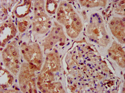 IHC image of CSB-PA621859LA01HU diluted at 1:1000 and staining in paraffin-embedded human kidney tissue performed on a Leica BondTM system. After dewaxing and hydration, antigen retrieval was mediated by high pressure in a citrate buffer (pH 6.0). Section was blocked with 10% normal goat serum 30min at RT. Then primary antibody (1% BSA) was incubated at 4°C overnight. The primary is detected by a biotinylated secondary antibody and visualized using an HRP conjugated SP system.