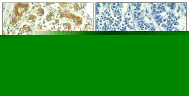Immunohistochemical analysis of paraffin-embedded human breast carcinoma tissue using syk(Ab-323) Antibody(left) or the same antibody preincubated with blocking peptide(right).