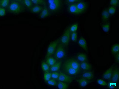 Immunofluorescence staining of Hela cells with CSB-PA890690NA01HU at 1:133, counter-stained with DAPI. The cells were fixed in 4% formaldehyde, permeabilized using 0.2% Triton X-100 and blocked in 10% normal Goat Serum. The cells were then incubated with the antibody overnight at 4°C. The secondary antibody was Alexa Fluor 488-congugated AffiniPure Goat Anti-Rabbit IgG(H+L).
