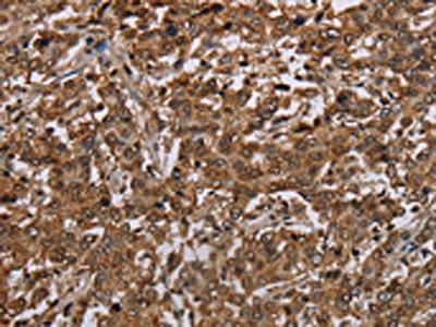 The image on the left is immunohistochemistry of paraffin-embedded Human liver cancer tissue using CSB-PA995324(TBX5 Antibody) at dilution 1/35, on the right is treated with synthetic peptide. (Original magnification: ×200)