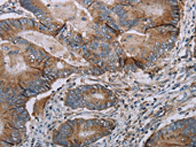 The image on the left is immunohistochemistry of paraffin-embedded Human colon cancer tissue using CSB-PA869654(TBX5 Antibody) at dilution 1/20, on the right is treated with synthetic peptide. (Original magnification: ×200)