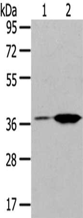 Gel: 8%SDS-PAGE,Lysate: 40 μg,Lane 1-2: Raji cells, Jurkat cells,Primary antibody: CSB-PA550037(TBXA2R Antibody) at dilution 1/200 dilution,Secondary antibody: Goat anti rabbit IgG at 1/8000 dilution,Exposure time: 40 seconds