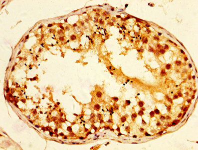 IHC image of CSB-PA023320LA01HU diluted at 1:800 and staining in paraffin-embedded human testis tissue performed on a Leica BondTM system. After dewaxing and hydration, antigen retrieval was mediated by high pressure in a citrate buffer (pH 6.0). Section was blocked with 10% normal goat serum 30min at RT. Then primary antibody (1% BSA) was incubated at 4°C overnight. The primary is detected by a biotinylated secondary antibody and visualized using an HRP conjugated SP system.