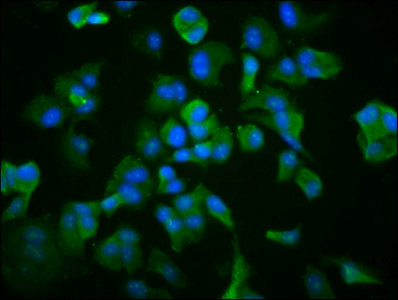 Immunofluorescence staining of MCF-7 cells with CSB-PA023320LA01HU at 1:266, counter-stained with DAPI. The cells were fixed in 4% formaldehyde, permeabilized using 0.2% Triton X-100 and blocked in 10% normal Goat Serum. The cells were then incubated with the antibody overnight at 4°C. The secondary antibody was Alexa Fluor 488-congugated AffiniPure Goat Anti-Rabbit IgG(H+L).