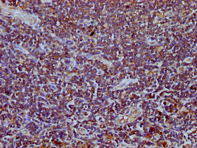 IHC image of CSB-PA857011LA01HU diluted at 1:400 and staining in paraffin-embedded human lymph node tissue performed on a Leica BondTM system. After dewaxing and hydration, antigen retrieval was mediated by high pressure in a citrate buffer (pH 6.0). Section was blocked with 10% normal goat serum 30min at RT. Then primary antibody (1% BSA) was incubated at 4°C overnight. The primary is detected by a biotinylated secondary antibody and visualized using an HRP conjugated SP system.