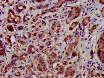 IHC image of CSB-PA023420LA01HU diluted at 1:500 and staining in paraffin-embedded human pancreatic cancer performed on a Leica BondTM system. After dewaxing and hydration, antigen retrieval was mediated by high pressure in a citrate buffer (pH 6.0). Section was blocked with 10% normal goat serum 30min at RT. Then primary antibody (1% BSA) was incubated at 4°C overnight. The primary is detected by a biotinylated secondary antibody and visualized using an HRP conjugated SP system.