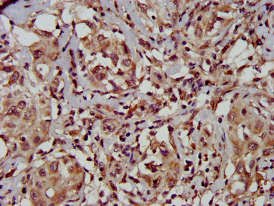 IHC image of CSB-PA023420LA01HU diluted at 1:500 and staining in paraffin-embedded human liver cancer performed on a Leica BondTM system. After dewaxing and hydration, antigen retrieval was mediated by high pressure in a citrate buffer (pH 6.0). Section was blocked with 10% normal goat serum 30min at RT. Then primary antibody (1% BSA) was incubated at 4°C overnight. The primary is detected by a biotinylated secondary antibody and visualized using an HRP conjugated SP system.