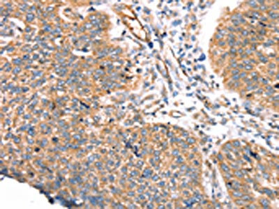 The image on the left is immunohistochemistry of paraffin-embedded Human liver cancer tissue using CSB-PA056705(TGFB2 Antibody) at dilution 1/30, on the right is treated with synthetic peptide. (Original magnification: ×200)