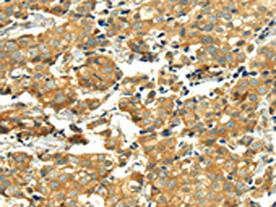 The image on the left is immunohistochemistry of paraffin-embedded Human breast cancer tissue using CSB-PA228573(TGM5 Antibody) at dilution 1/25, on the right is treated with synthetic peptide. (Original magnification: ×200)