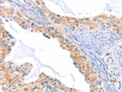The image on the left is immunohistochemistry of paraffin-embedded Human cervical cancer tissue using CSB-PA901283(THBS1 Antibody) at dilution 1/60, on the right is treated with synthetic peptide. (Original magnification: ×200)