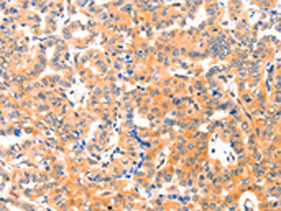 The image on the left is immunohistochemistry of paraffin-embedded Human thyroid cancer tissue using CSB-PA901283(THBS1 Antibody) at dilution 1/60, on the right is treated with synthetic peptide. (Original magnification: ×200)