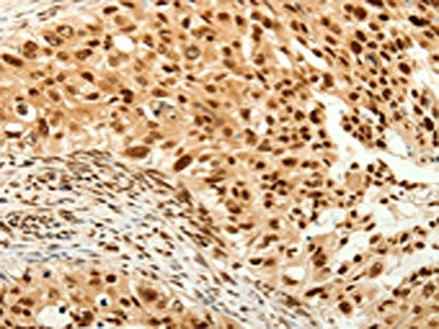 The image on the left is immunohistochemistry of paraffin-embedded Human cervical cancer tissue using CSB-PA162542(TIGAR Antibody) at dilution 1/80, on the right is treated with synthetic peptide. (Original magnification: ×200)