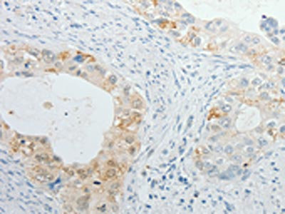 The image on the left is immunohistochemistry of paraffin-embedded Human cervical cancer tissue using CSB-PA827458(TIMP1 Antibody) at dilution 1/15, on the right is treated with fusion protein. (Original magnification: ×200)